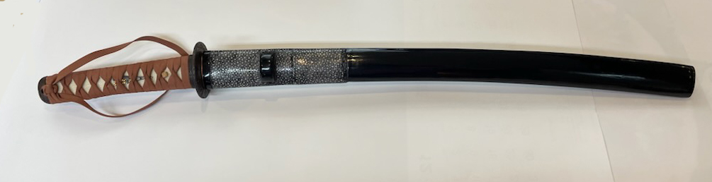 当館のお弟子さんが是非ともと購入されました。試斬で使っている大刀の鞘に鮫皮を使用しているので 脇差の鞘にも鮫皮を巻いてみました。刀匠からおまけで貰った鮫皮を使ったのでつぎはぎなりました。 鯉口、栗型、小尻も自作でできるだけお金をかけないようにしました。さあ!2刀の試斬を稽古しましょう!!